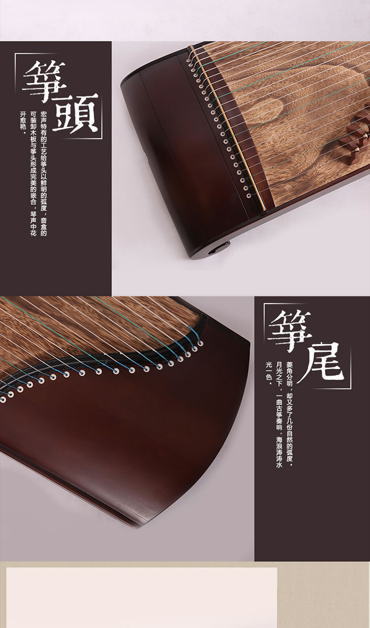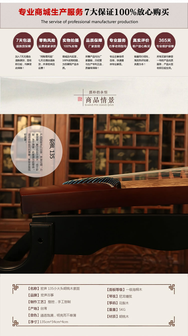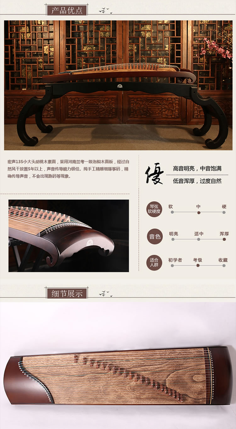 商品名称:宏声古筝135小大头胡桃木素面挖筝 高端演奏筝